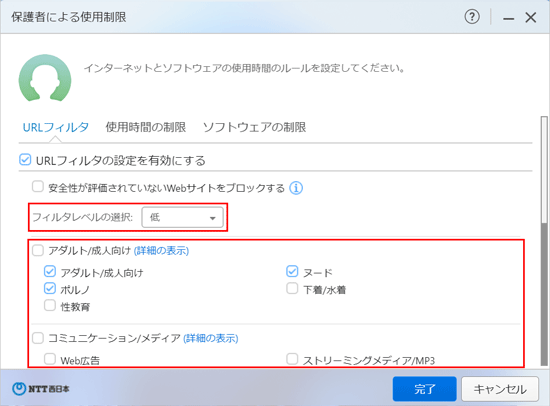URL フィルタ設定画面にて、適切なフィルタレベル、またはカテゴリの 有効 / 無効 の設定を変更します。